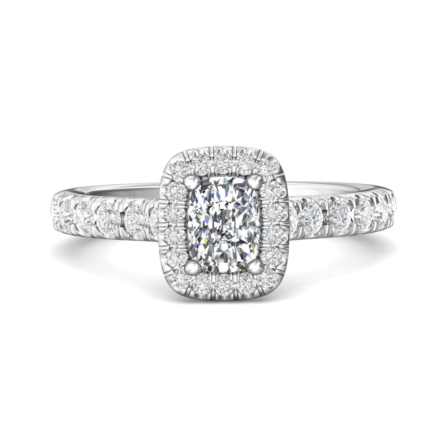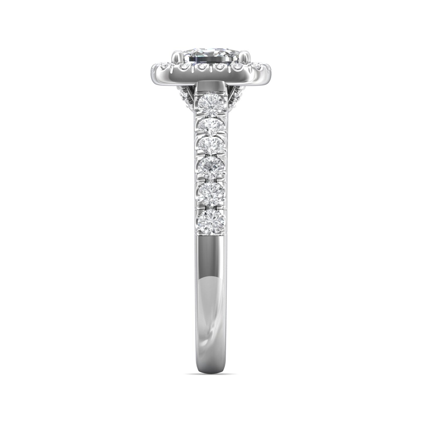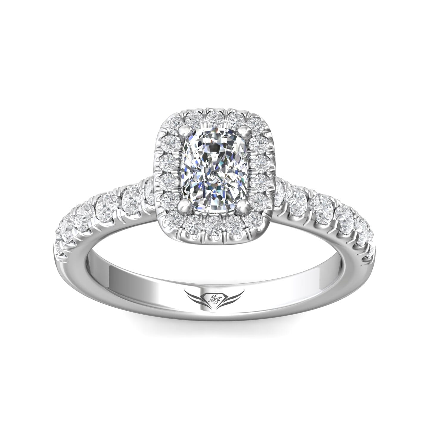 Classically elegant and timeless in design, this FlyerFit Halo engagement ring showcases more sparkle from the cutdown micropavé setting style adorning the band.